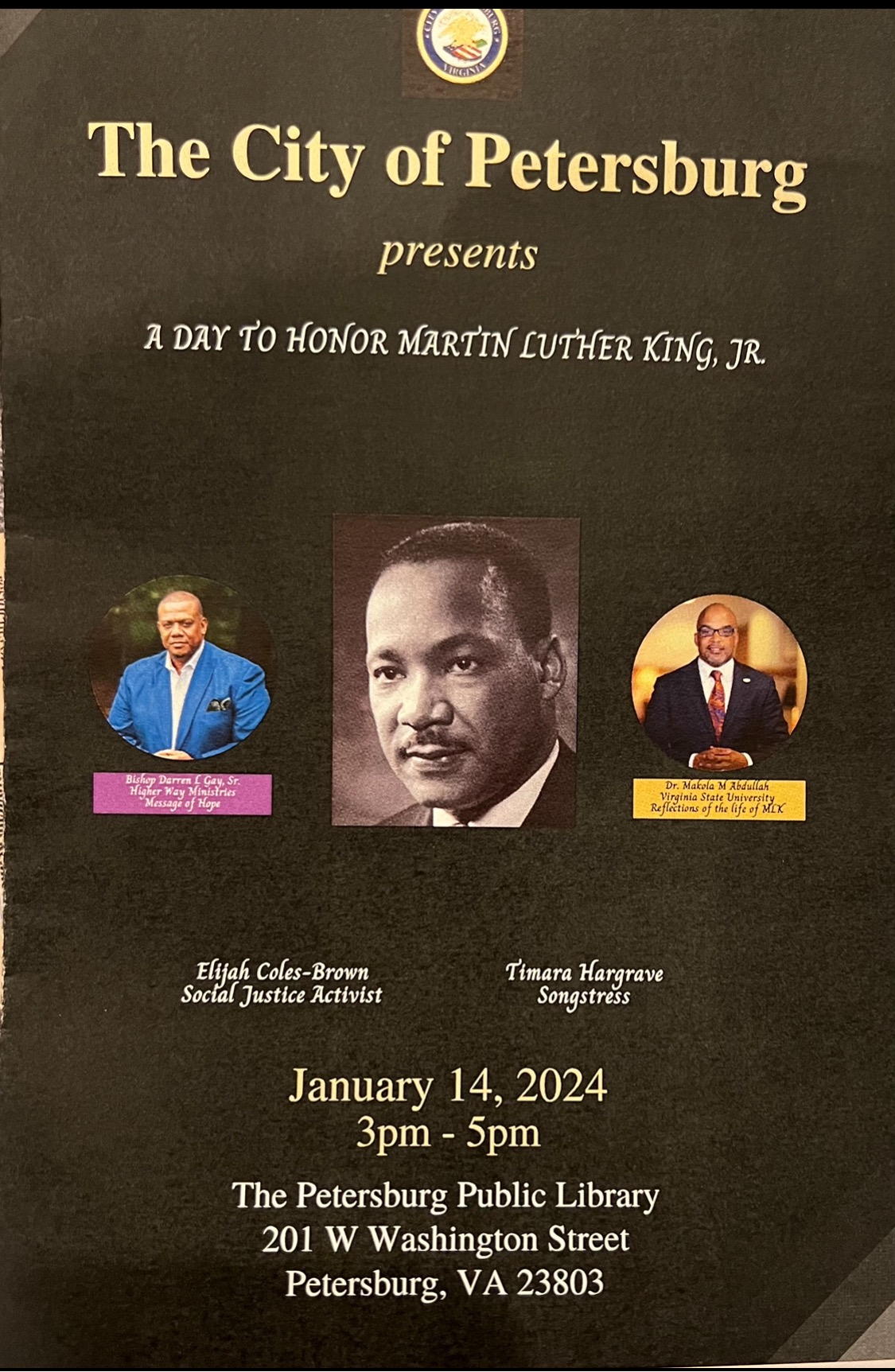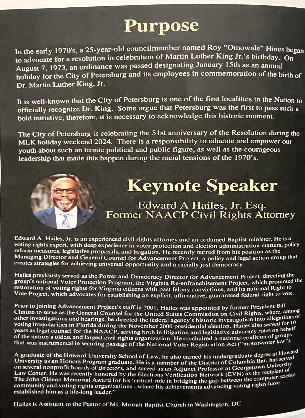 It is the opinion of this committee that besides celebrating the birth of Jesus, the most significant national holiday observed in this country is none other than that of the Reverend Doctor Martin Luther King Jr. Indeed, as celebrations and observances were held throughout this nation, many of us had an opportunity to get an account of activities from some of the stalwarts that were directly involved in the struggle for Civil Rights. Many keynote speakers at events across this nation were directly involved in the battle for Civil Rights or had a close connection with someone who was. This committee enjoyed attending such a gathering in the city where the idea and first MLK holiday was conceived and birthed, Petersburg, Va. Yes, I said that correctly! More to follow on the subject below. But first, let’s talk about the superb program that was witnessed in the “Cockade City.” On January 14, 2024, the city of Petersburg presented its “A Day to Honor Martin Luther King, Jr.” program to a capacity crowd of over 200 enthusiastic residents whereby the keynote speaker for the occasion was none other than the renowned former NAACP Civil Rights Attorney, Brother Edward A Hailes, Jr. Esq. 1-74 Alpha. Among the many topics of thought and reflection, Brother Hailes Jr. spoke directly about his association with the city of Petersburg through his father, Brother Edward A Hailes, Sr. Zeta 48′. He recounted how his father spent many days on the front lines in the struggle for civil rights during their many years of residence in Petersburg. Also highlighted by the keynote speaker was how Brother Hailes Sr.’s time spent on the front lines of social justice in Petersburg had a major impact on him leading the charge for civil rights as the Executive Director of the D.C. Branch of the NAACP. Brother Hailes Jr. captivated his audience as he spoke about Dr. King’s several visits to Petersburg. Though Dr. King conceived the idea of “Non- Violence from Mohandas K. Gandhi, he modeled his movement from much of the work he observed which had taken place on the front lines in Petersburg. Regarding the city of Petersburg being the first to recognize MLK Day as a holiday, the committee pulled the information below from the city’s official website, posted on January 9, 2024, for you to consider.