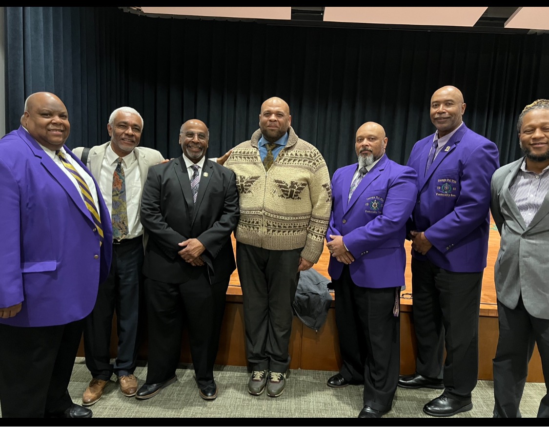 L to R: Third District KRS Brother Craig Branch-Nu Psi 96’, Brother Bruce R. Bennett-Alpha 75’, Brother Edward Hailes Jr. Esq.-Alpha 74’, Brother William Bland III Omicron-Omega 05’, Brother Kevin M. Smith-Delta Omega 20’, H & A Chairman Brother Terence Spence-Delta Omega 18’, Petersburg City Councilman Brother Arnold Westbrook-Delta Omega 99’