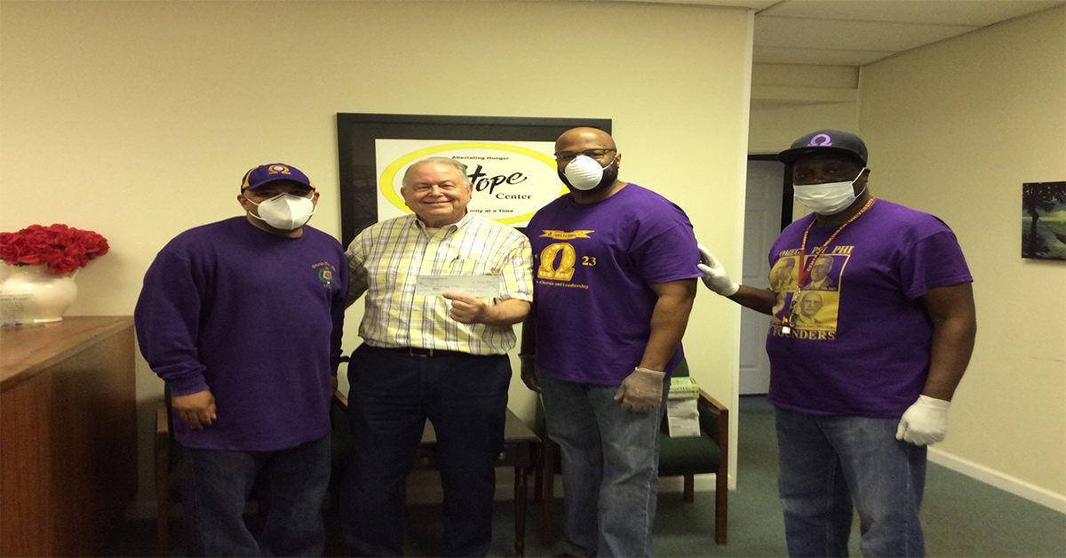 May 2020. The Delta Omega Chapter of Omega Psi Phi, Inc., Covid-19 Mitigation Team made 2 separate donations of 100 Masks and 100 Gloves to 2 separate entities . Brother Marlon Penn met with and delivered 100 masks/gloves to Jamal Ellison, Petersburg Community In Schools(CIS) rep., at Mt. Olivet Baptist Church, while they were issuing out care packages. Additionally, Brother Penn, along with Brother Herman ‘Jack’ Robinson and Brother Henry Davis, met with Mr. Scott Fisher, Executive Director of Downtown Churches United Inc./The Hope Center to present 100 masks/gloves, as well as a $150 monetary donation. The Presentation was done at The Hope Center, Petersburg, VA.