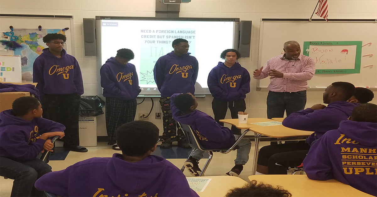 Bro. Wilton Anderson, Potomac Senior High social studies teacher and Omega U Director mentors and provides pearls of wisdom with Omega U high school students to the Omega U middle school students from Potomac Middle on December 20th, 2018 at Potomac Senior High School in Woodbridge Virginia