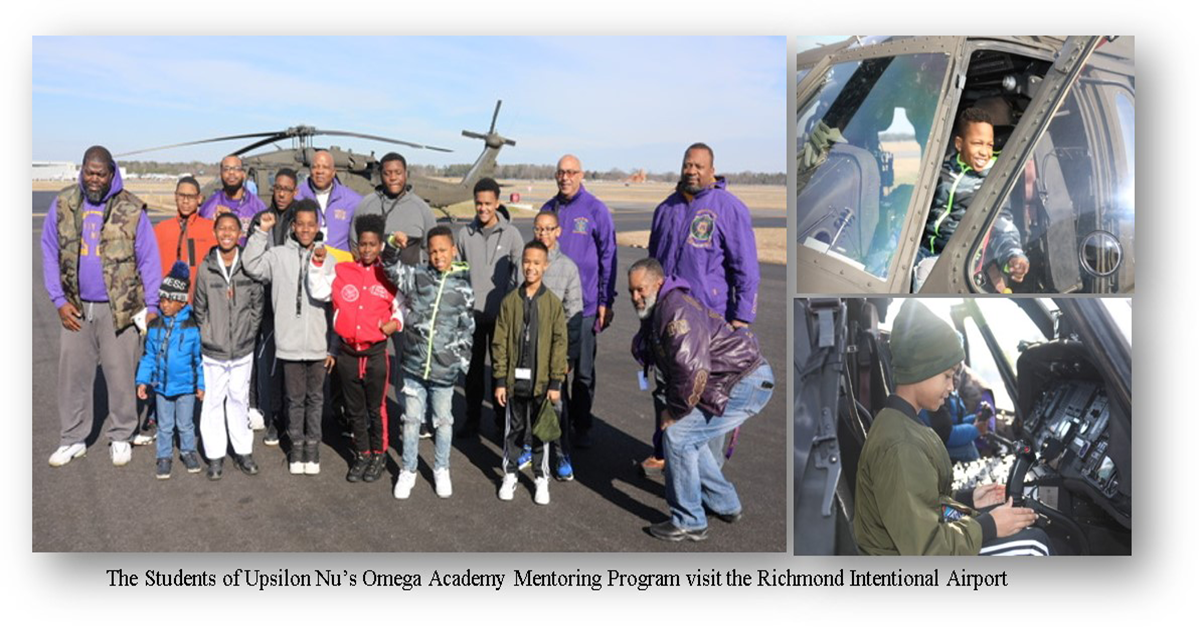 Sandston, Virginia Saturday February 2, 2019, Upsilon Nu Omega Academy Mentoring program, was in full session with aviation. Program Chairman Brother Patrick Patrong and members of the committee and other chapter brothers, took the mentees to Richmond International Airport. Richmond International Airport is a joint civil-military public airport about 7 miles southeast of downtown Richmond. One of the modules of the mentoring program is to introduce the kids to types of careers they may have not thought about and hopefully spark interest.