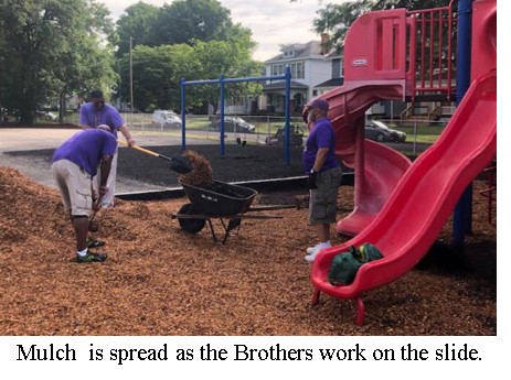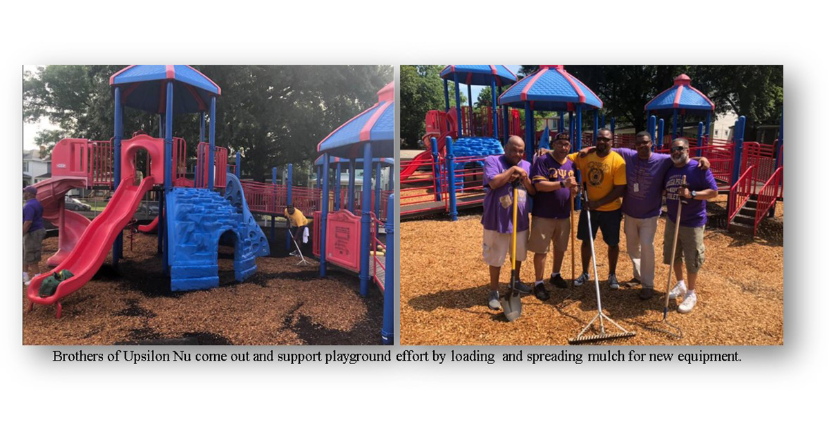 Richmond, Virginia, Saturday, May 18, 2019. Upsilon Nu Chapter supported Barack Obama Elementary by helping set up their playground area and beautify it with mulch for the playground. Debris was removed from all around the site, to prep it for the laying of piles of mulch.  Brother Tim Brown organized the effort for the chapter. I am happy we were able to come out and support this effort, the renaming of the schools was a very observed event in Richmond, the community was out in force which just shows what the community can do when they raise their voices, stated Brother Michael Edwards.
