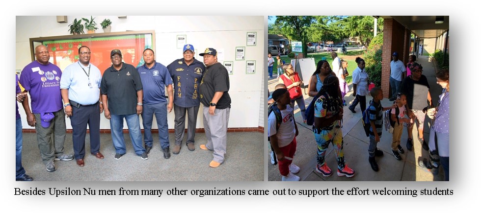 Richmond, Virginia, Tuesday, September 3, 2019, Upsilon Nu came out to support the Welcome Back to School event throughout the Greater Richmond area. The purpose of the First Day of School event was is to provide encouragement to the kids returning back to school. This was done in several states. In some schools we were asked to participate and wear attend in either shirt and tie, or omega casual attire. This was to provide kids with images of African Americans in professional attire and not Urban wear. Several of the schools are recipients of the book bags and school supplies donated by these organizations. “I remember going to Henderson Middle to give out backpacks for the students,” stated Brother Christian.